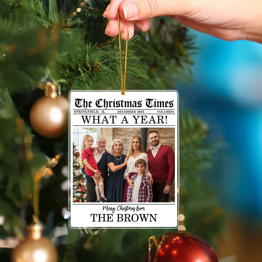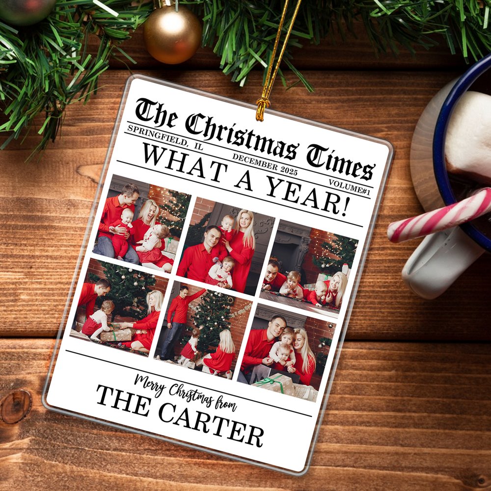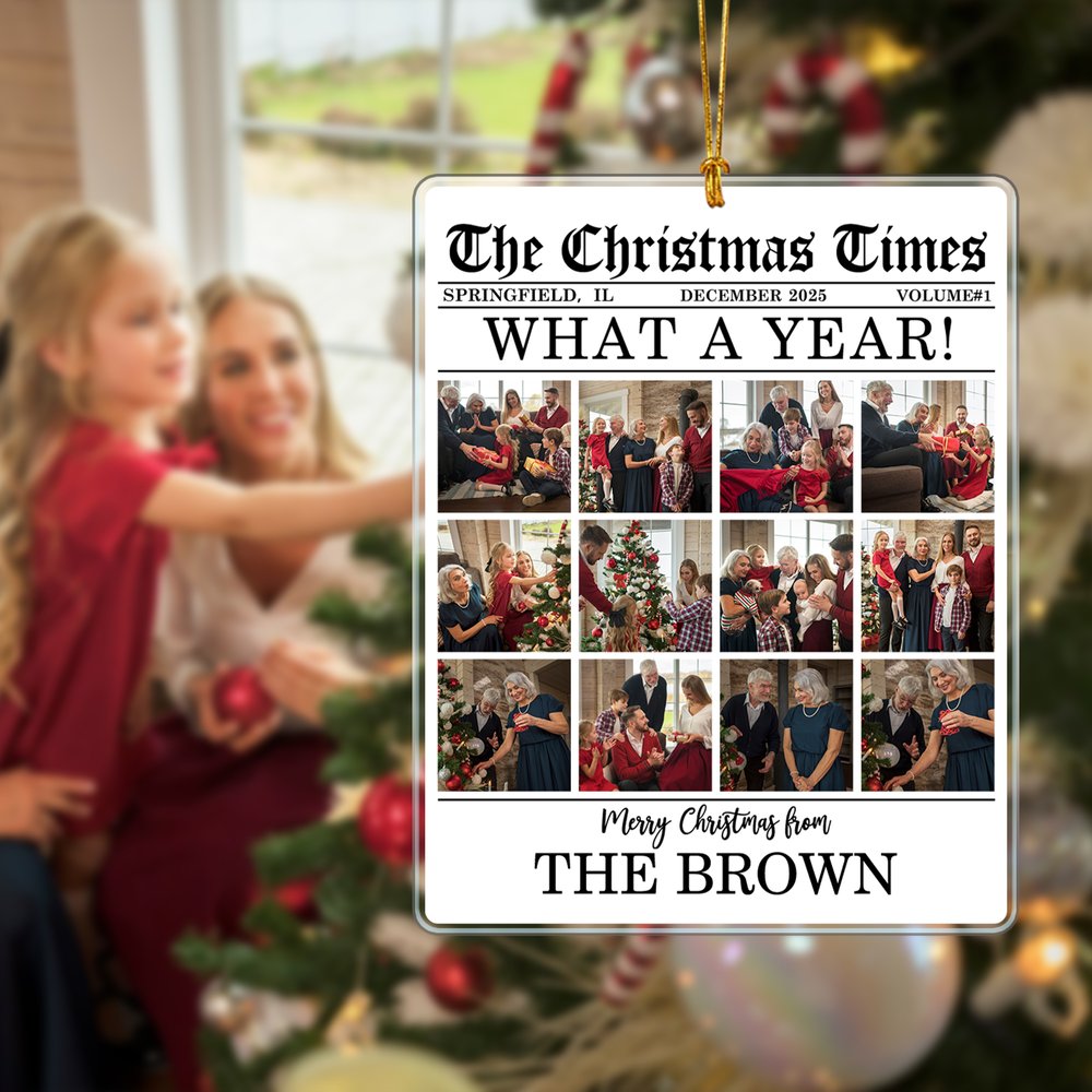 Tässä innovatiivisessa koristeessa on Christmas Times -sanomalehden tyylinen ulkoasu, jossa on rakkaat valokuvasi ja muokattavissa oleva teksti, mikä luo todella ainutlaatuisen koristeen, joka kuvastaa perheen lämpöä. Se ei ainoastaan tee kunniaa perheen iloisille hetkille ja kauniille muistoille, vaan myös inspiroi meitä vaalimaan jokaista rakkaidemme kanssa vietettyä hetkeä.