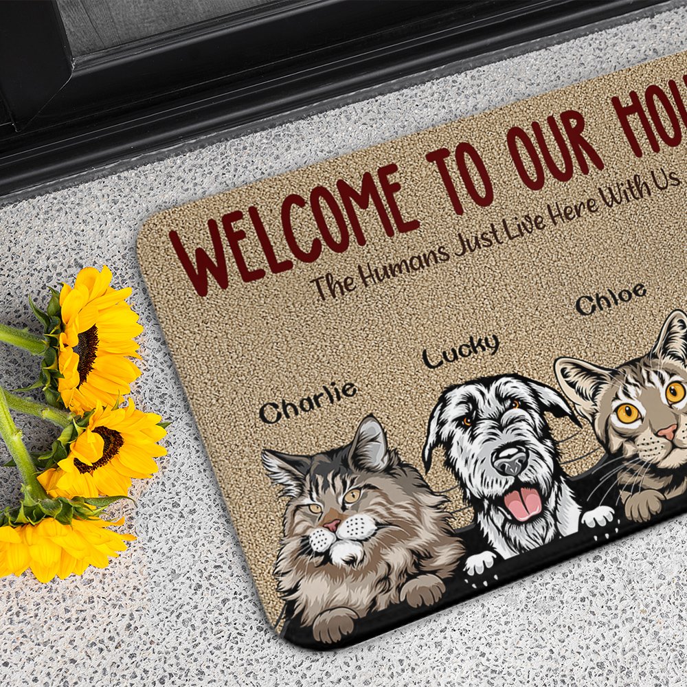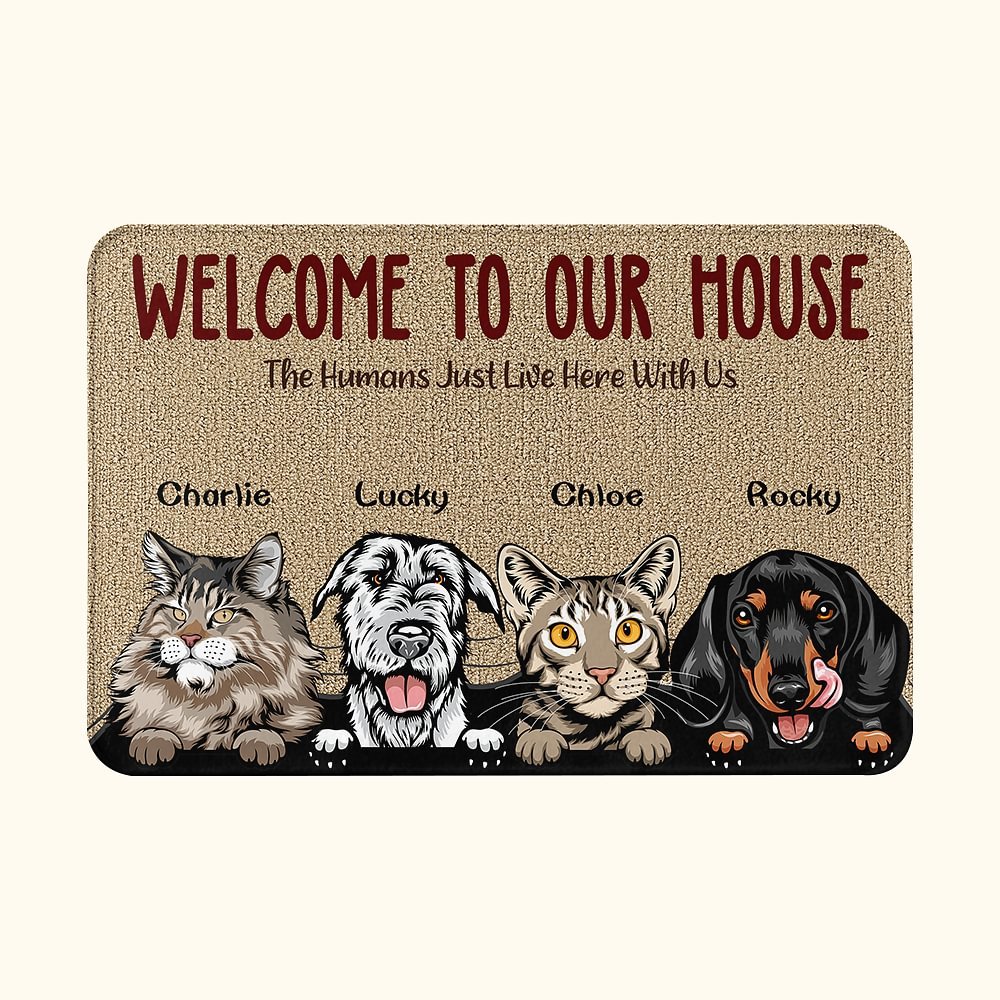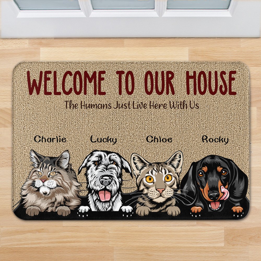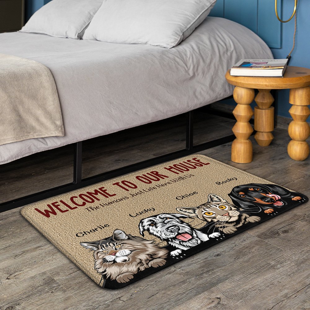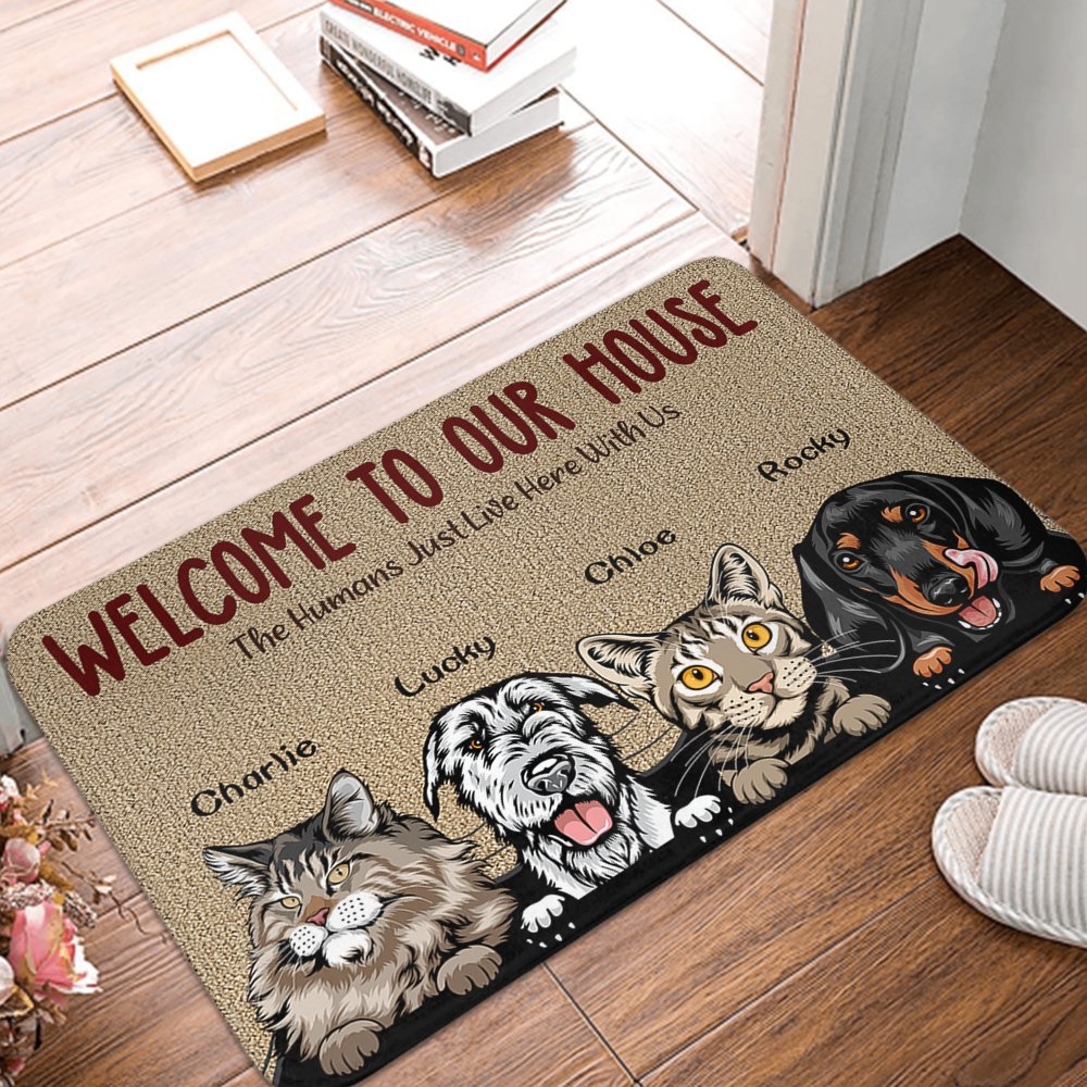 The message "The Humans Just Live Here With Us" is beautifully printed on the floor mat, means that pets are human family members too.