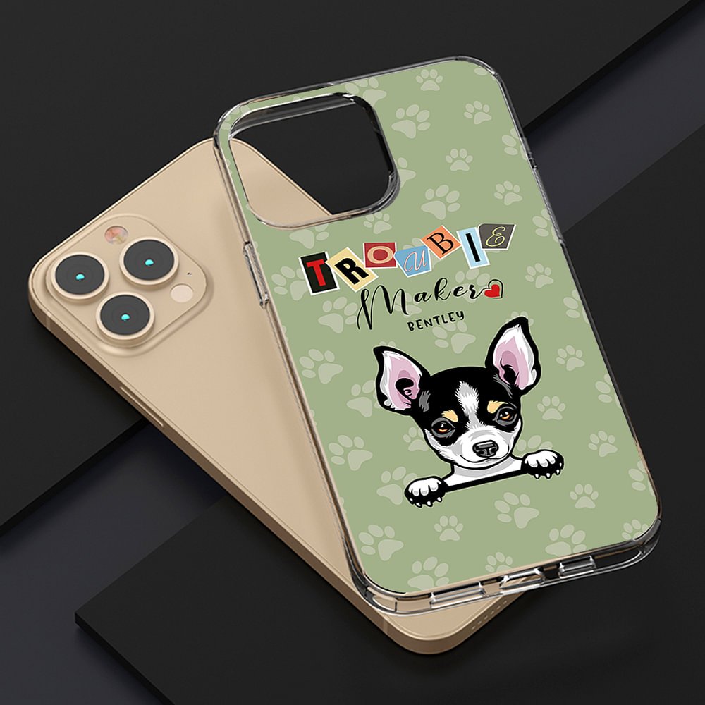 Puhelinkotelomme ovat lemmikkieläinaiheisia ja saatavilla useissa eri väreissä, ja niiden taustalla on tassunjälki, keskellä söpö lemmikki ja nokkela "Trouble maker" -lause. Voit vapaasti valita lemmikkisi rodun ja lisätä lemmikkisi nimen, jotta siitä tulee ainutlaatuinen ja huomaavainen lahja.