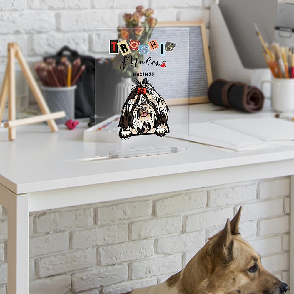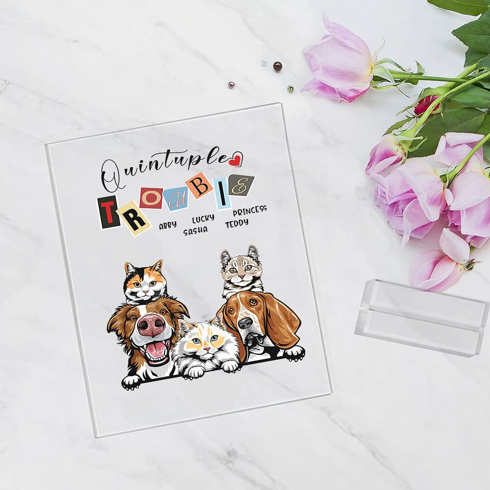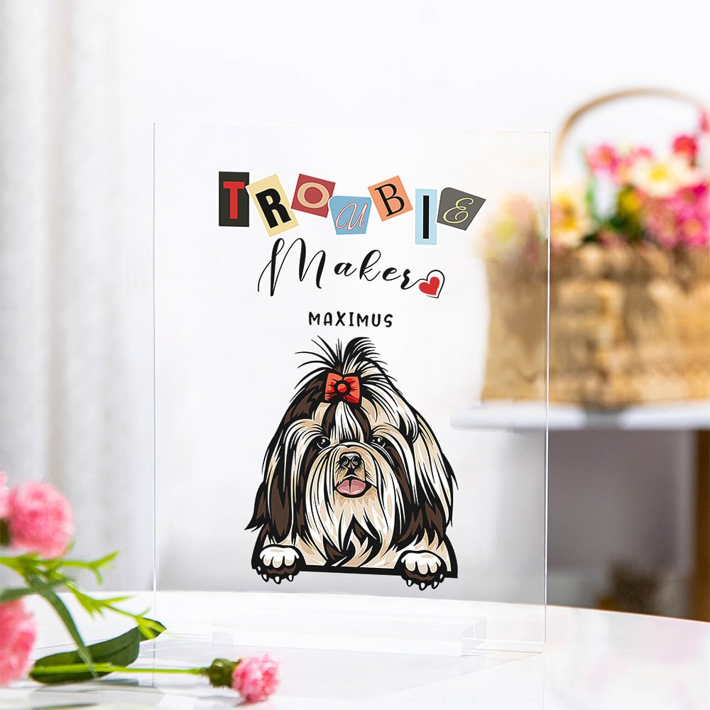 Are you looking for the perfect gift for a pet lover in your life? Look no further than this pet clear acrylic plaque. With the humorous message "Trouble Maker" and the option to customize with 1-6 cats or dogs, this high-quality desk decor is sure to bring a smile to any pet lover's face.