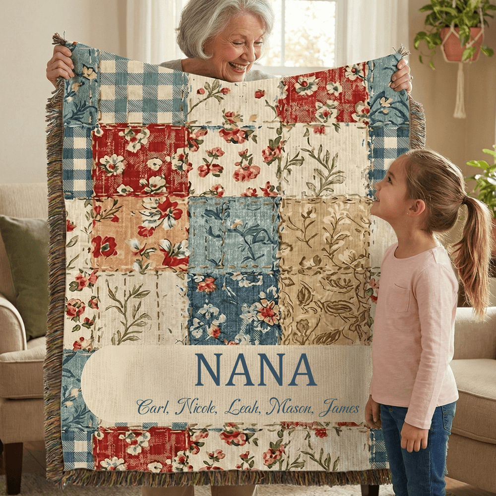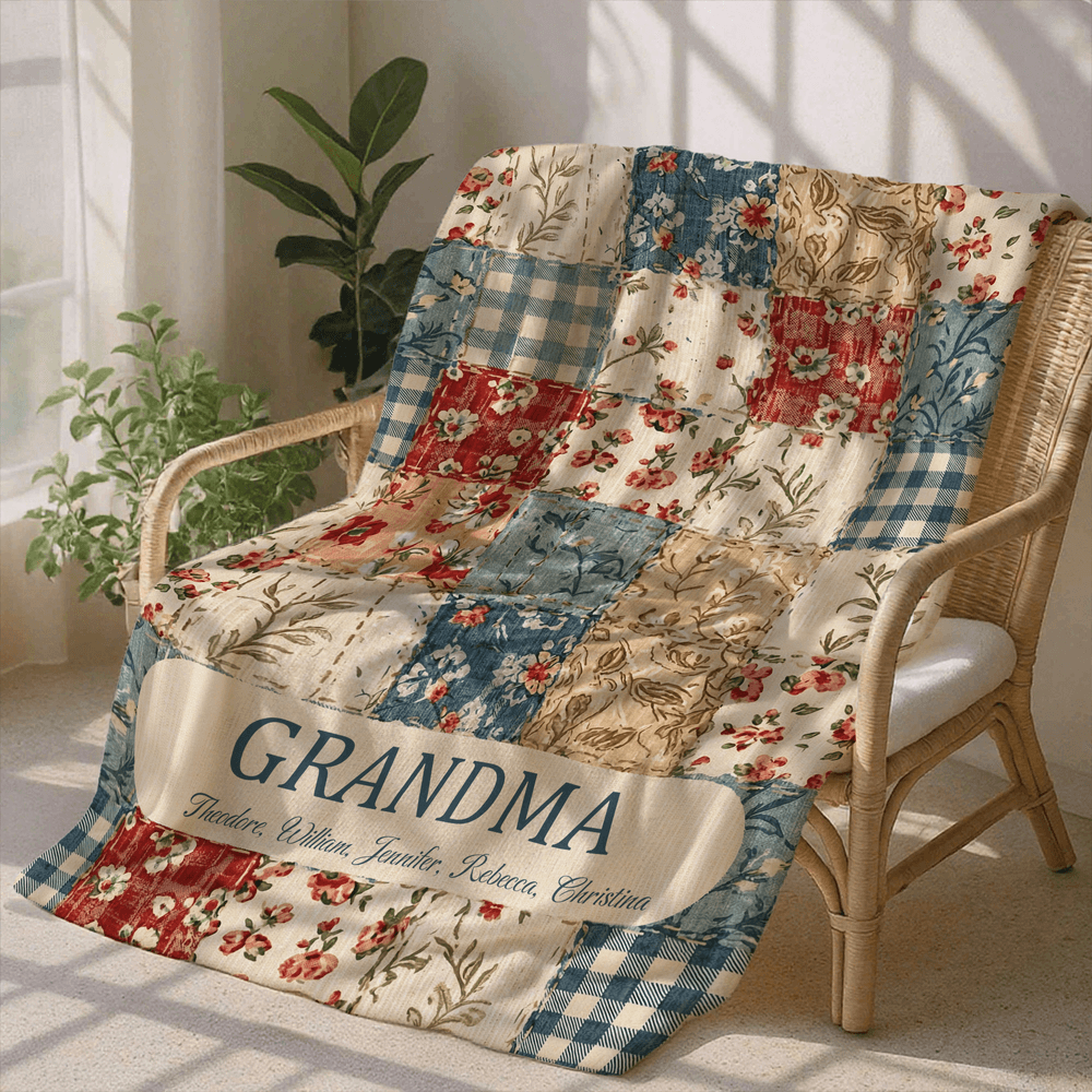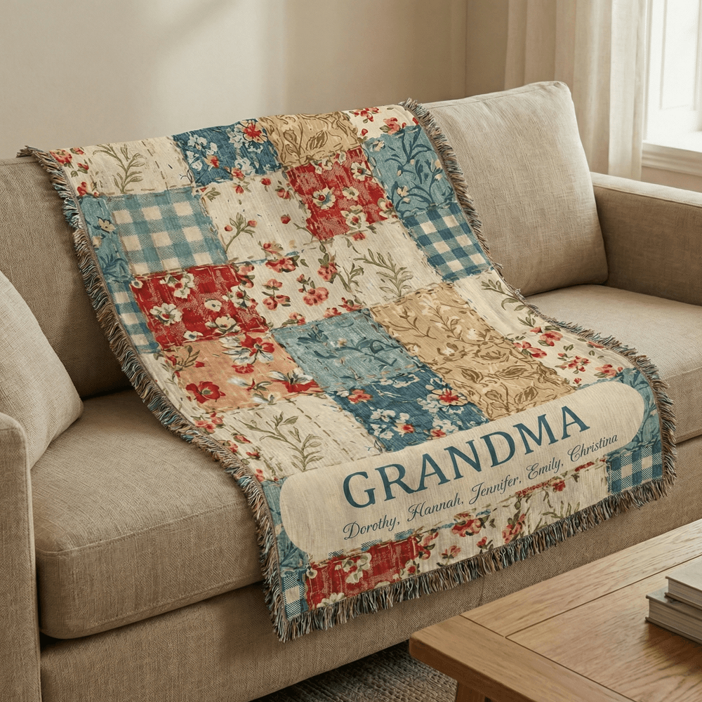 Huopaa koristaa hieno vintage-kukka- ja ruutukuvio, ja se on saatavana sekä tavallisena flanelli- että tupsuflanellivaihtoehtona. Se voidaan personoida mukautetulla otsikolla vanhimmille ja useiden perheenjäsenten nimillä, mikä vangitsee perhesiteen lämmön ja ajattoman viehätyksen.