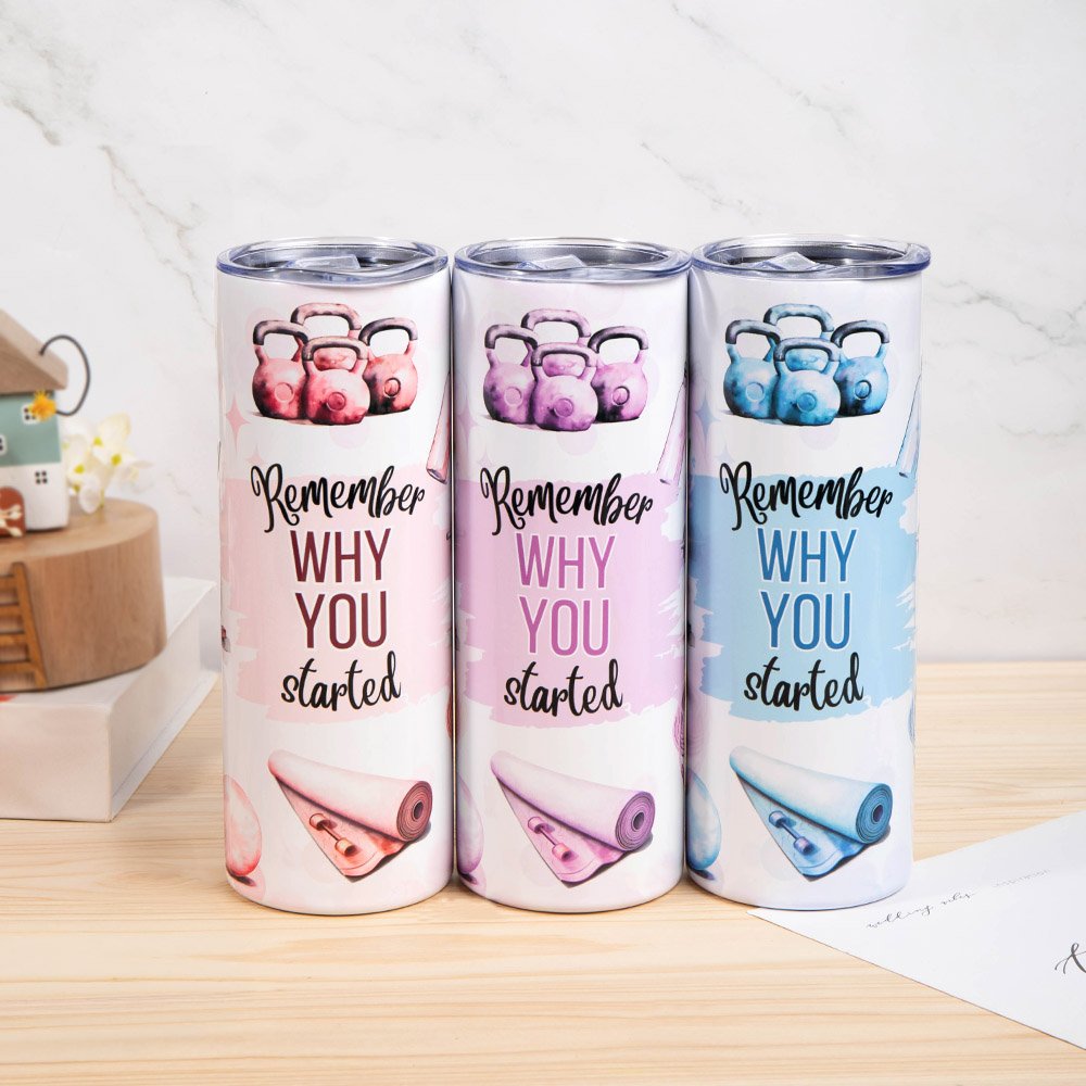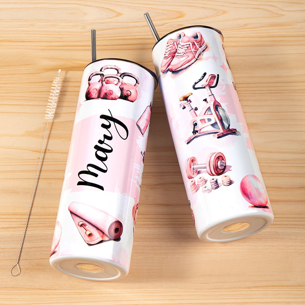 Ohut tumblerimme on suunniteltu kuntoilua ajatellen, ja siihen on lisätty vesiväritehosteisia tangoja, hyppynaruja, lenkkareita, joogamattoja ja muita kuntoiluvälineitä, jotka tuovat esiin dynaamisen urheiluteeman. Voit valita motivoivia sanoja tai henkilökohtaisia nimiä, jotka lisäävät lahjan huomaavaisuutta ja joista tulee arvokas matkamuisto.