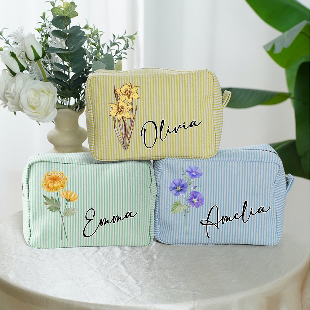 Henkilökohtainen vesiväri Retro syntymä kukka monivärinen raidallinen meikki laukku nimi Travel Essential häät osapuoli syntymäpäivä lahja naisille tytöille