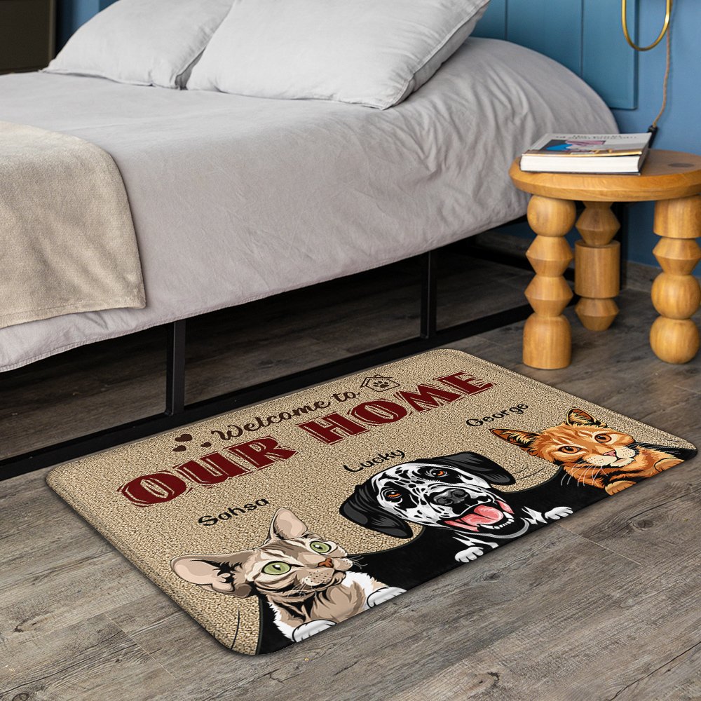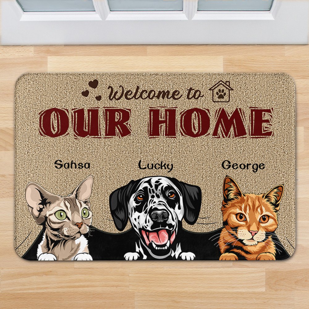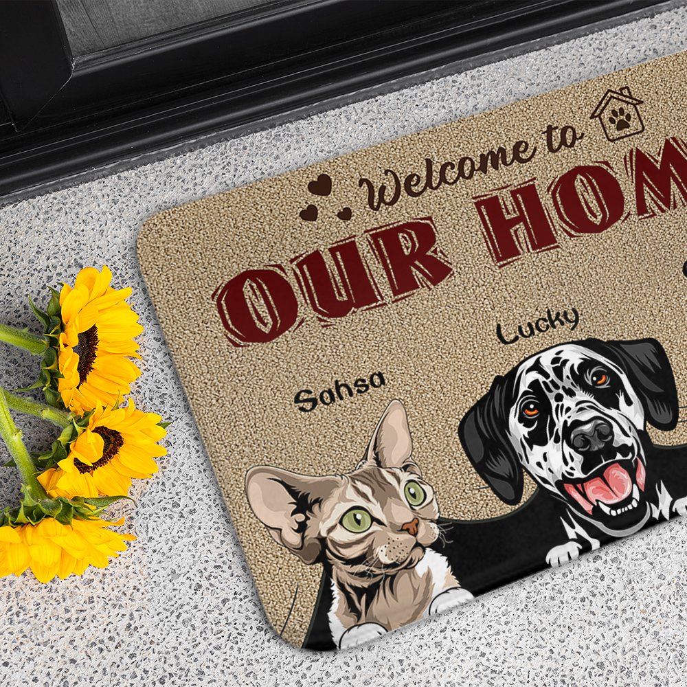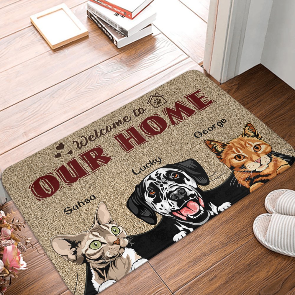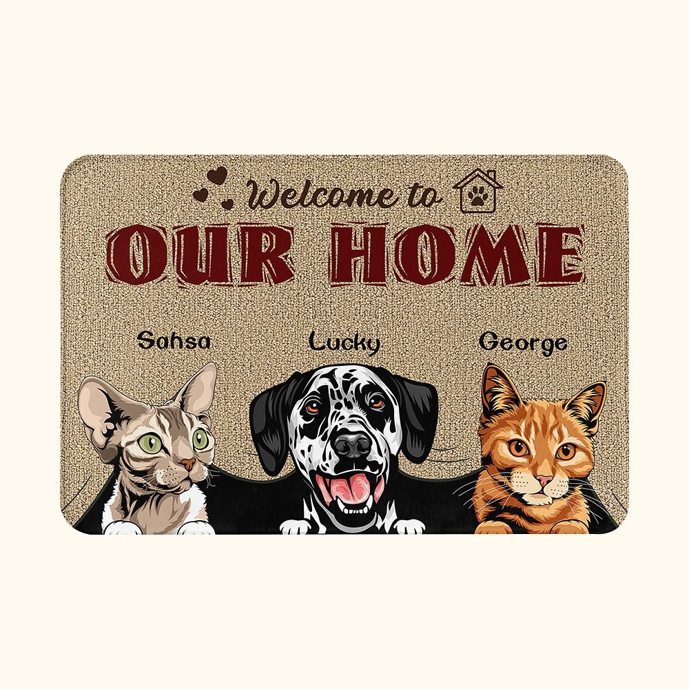 The message "Welcome To Our Home" is beautifully printed on the floor mat, means that pets are human family members too.