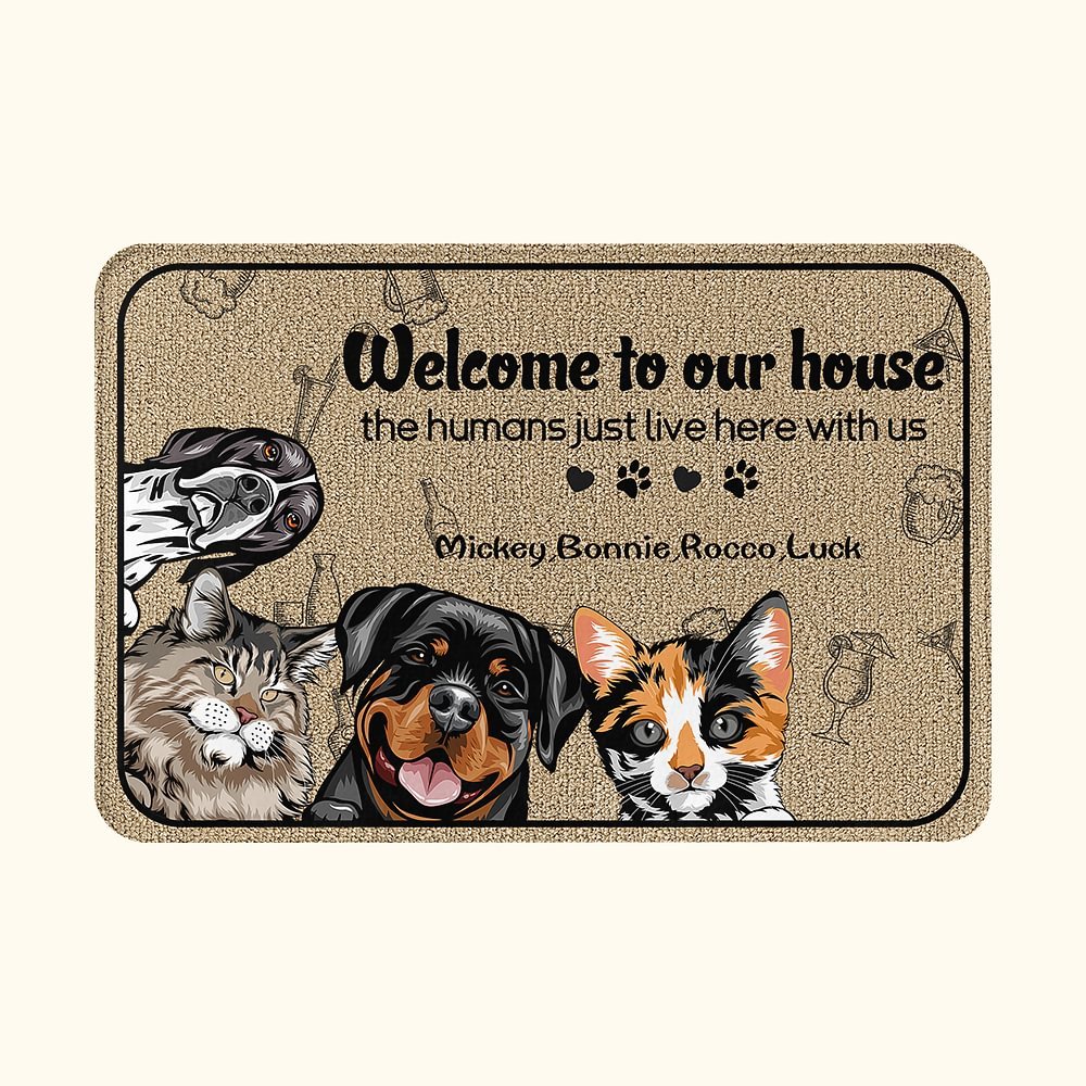 With the playful text "Welcome to my/our house, the humans just live here with us", this mat serves as an interesting home decor. It's a fun and playful way to express your love for your pet and set a lighthearted tone in your household.