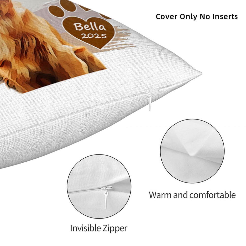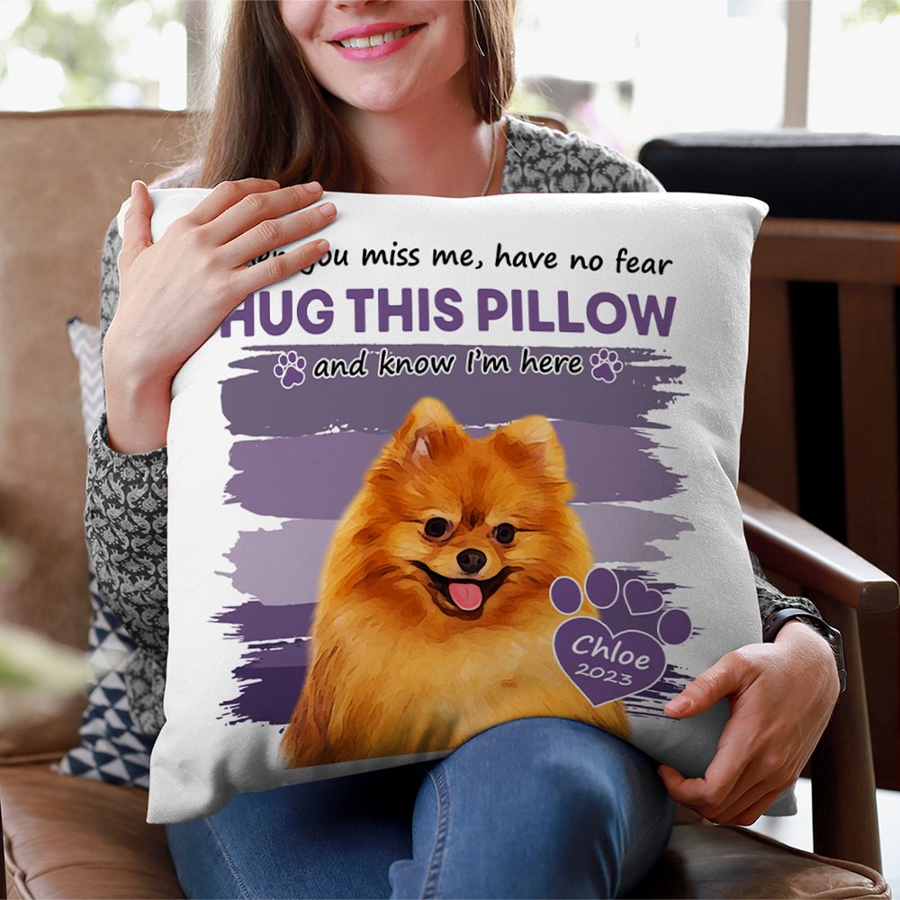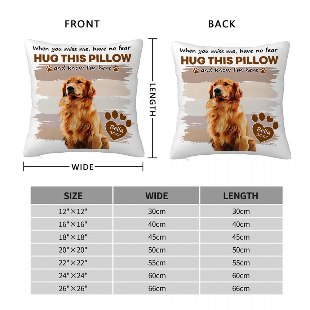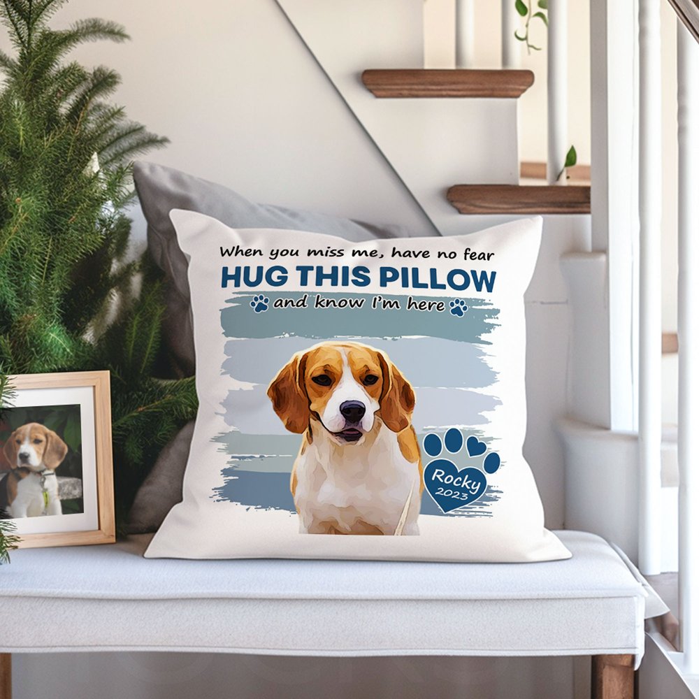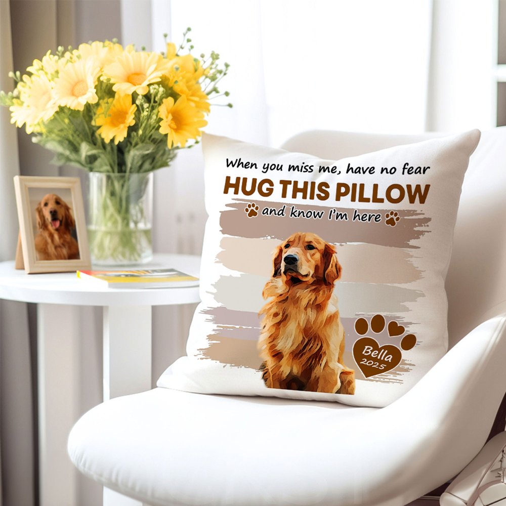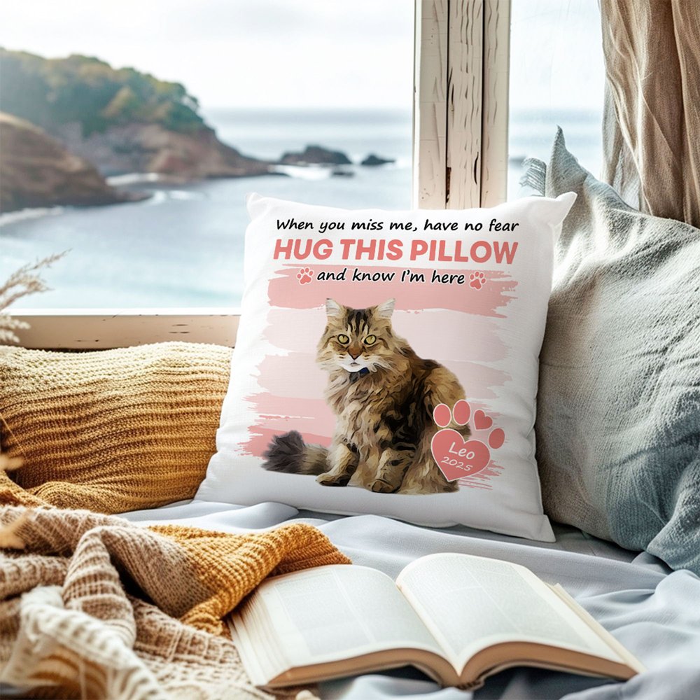 Siinä on koskettava teksti "Kun kaipaat minua, älä pelkää, halaa tätä tyynyä ja tiedä, että olen täällä" lemmikkieläimen kuvan vieressä. Lohduttavat sanat tarjoavat lohtua hetkillä, jolloin kaipaat rakasta lemmikkiseuraa. Tekstin ja kuvan harkittu yhdistelmä luo henkilökohtaisen muistomerkin. Täydellinen arvokkaiden muistojen pitämiseen lähellä vaikeina aikoina.