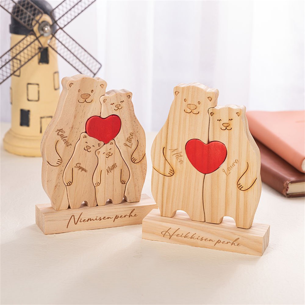 Tässä puisessa palapelissä on sydämellinen karhuperheaihe, jossa jokainen suloinen, ainutlaatuisesti muotoiltu karhu edustaa eri perheenjäsentä. Voit valita 2-6 karhua ja kaivertaa niille jokaiselle oman nimen. Koko perheen sukunimi voidaan kaivertaa palapelin jalustan etuosaan. Luonnolliset puun sävyt yhdistettynä keskeiseen punaiseen sydämeen luovat kodikkaan ja rauhoittavan tunnelman.