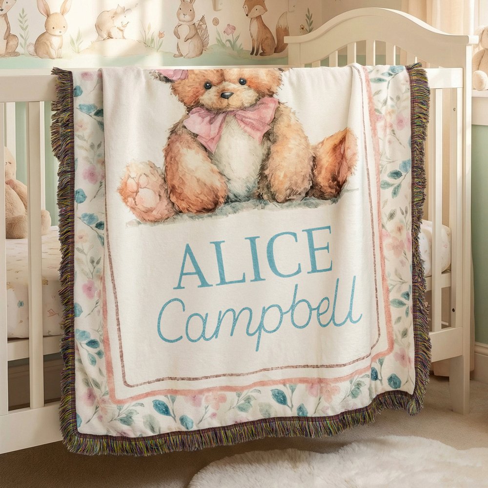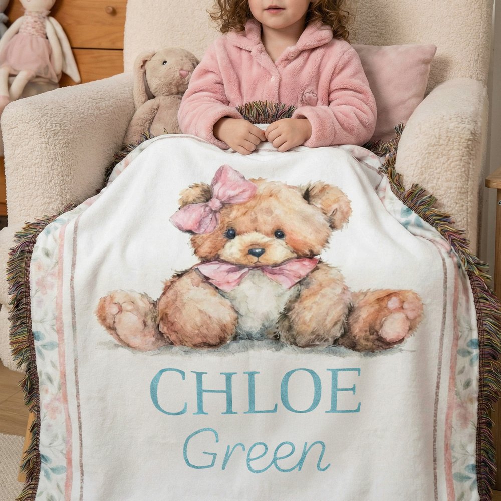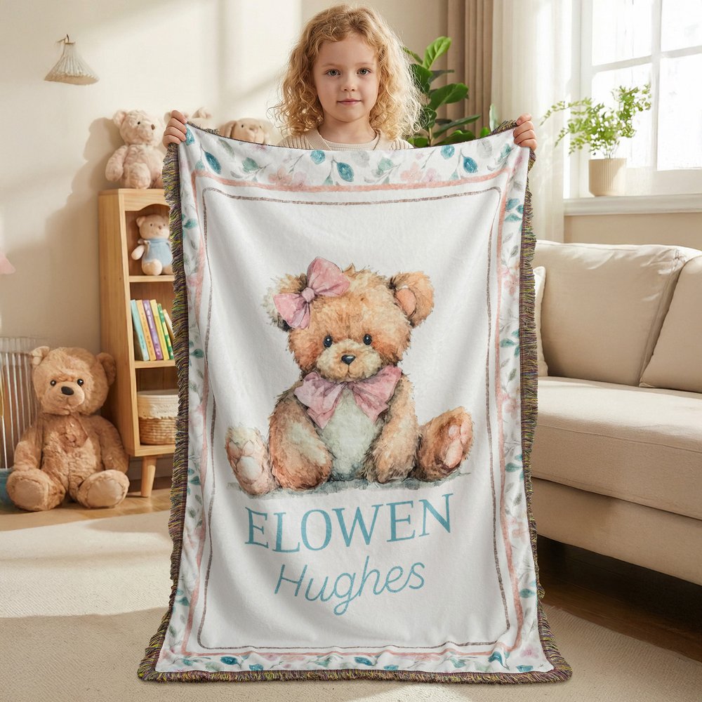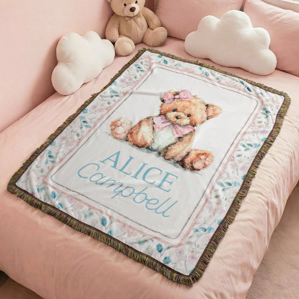Tässä yksilöllisessä kudotussa huovassa on suloinen nallekuvio, ja se on vaaleanpunainen ja sininen, mikä luo lämpimän ja kodikkaan lastenhuoneen tunnelman. Silmiinpistävä mukautettu nimikuvio lisää entisestään viehätystä, mikä tekee tästä peitosta todella ainutlaatuisen ja antaa vauvallesi erityisen tunteen.