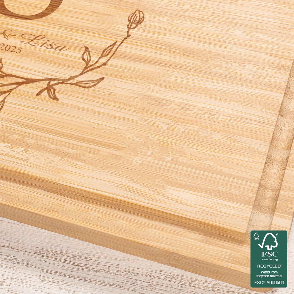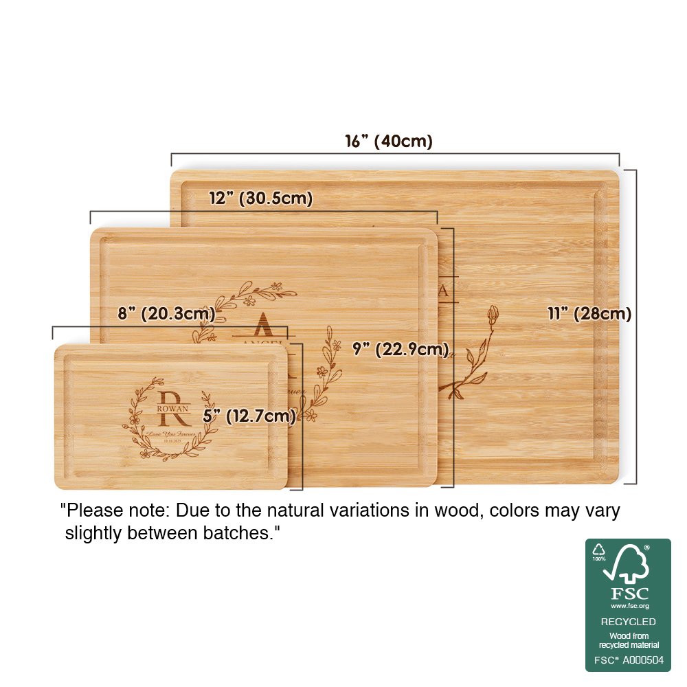 Leikkuulauta erottuu edukseen ainutlaatuisilla muotoiluominaisuuksillaan. Yläpuolella olevat kolme seppeleen kuviota tuovat taiteellisen kosketuksen ja korostavat omaleimaista elämänmakua. Leikkuulaudan voi myös räätälöidä nimikirjaimilla, nimillä, tekstillä ja päivämäärillä, jotta siitä tulisi vieläkin erikoisempi. Valittavana on kolme kokoa, jotka rikastuttavat valintojasi.