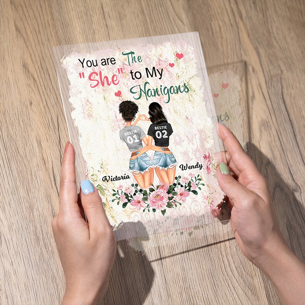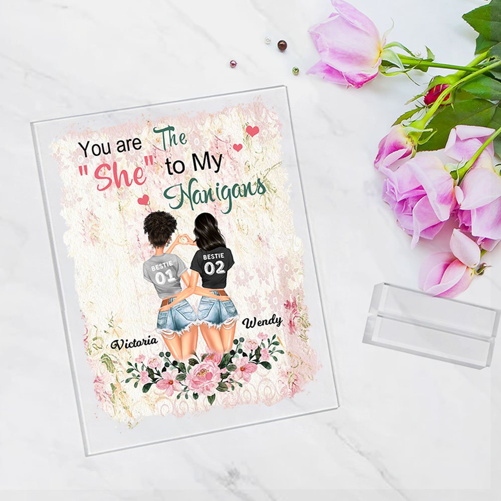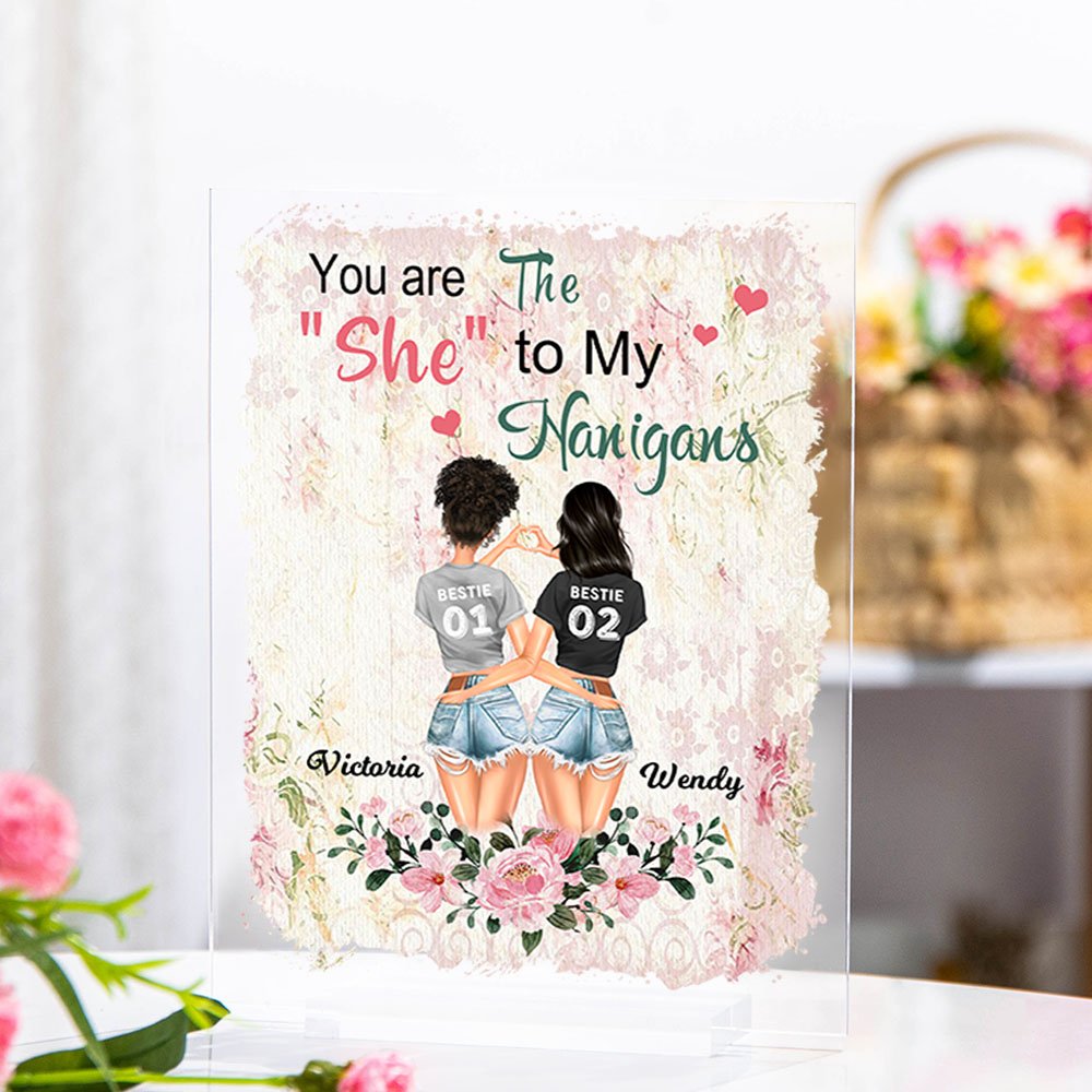 This acrylic plaque is the perfect gift for your best friend as it can be customized with your and your friend's name and appearance, adding a personal touch to the gift.