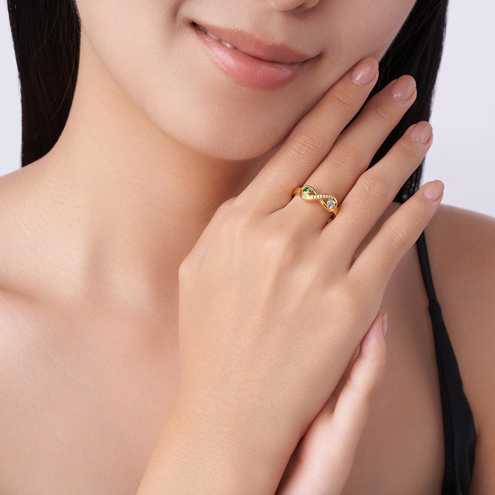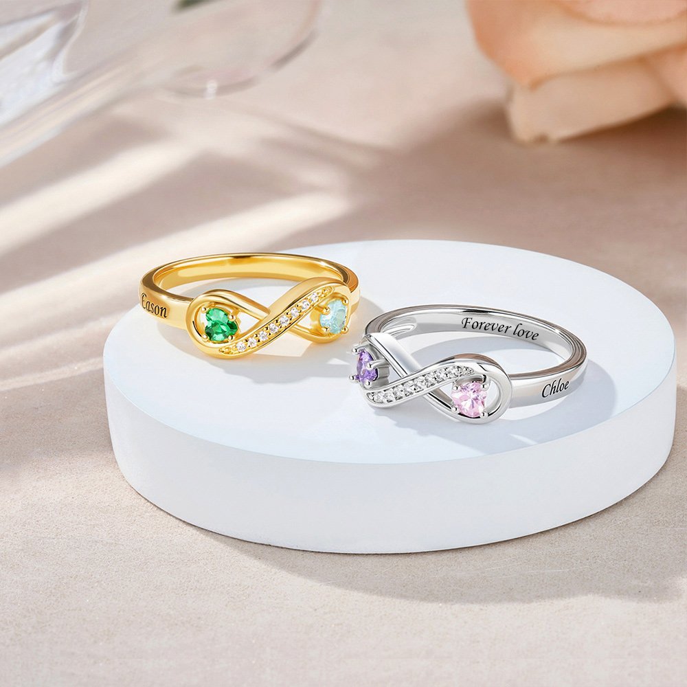 Sormuksessa yhdistyvät taitavasti äärettömyyssymboli ja kaksoissydänelementit, jotka symboloivat loputonta rakkautta ja toisiinsa läheisesti liittyviä sydämiä. Kaksi kiiltävää syntymäkiveä voidaan räätälöidä parin syntymäpäivän mukaan, mikä viittaa siihen, että "Sinä olet se, joka on tarkoitettu minulle". Lisäksi voit kaivertaa molempien osapuolten nimet sormuksen pintaan ja erityisen tekstin sormuksen sisälle, jotta voitte luoda romanttisen tarinan välillenne.