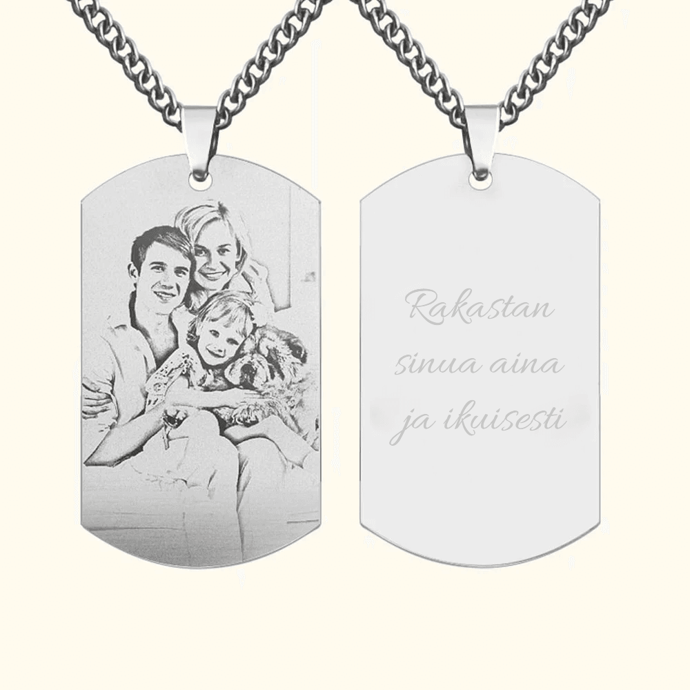 Kaulakorun etupuoleen kaiverretaan lataamasi valokuva olipa kyseessä lämmin perhekuva rakastava hetki puolison kanssa tai henkilökohtaisesti merkittävä muisto. Muisto muuntuu ainutlaatuiseksi kaulakoruksi joka kulkee mukanasi ja toimii henkilökohtaisena tunnesiteenä. Takapuolelle voidaan kaivertaa haluamasi teksti joka välittää saajalle merkityksellisen viestin ja parhaat toivotukset.